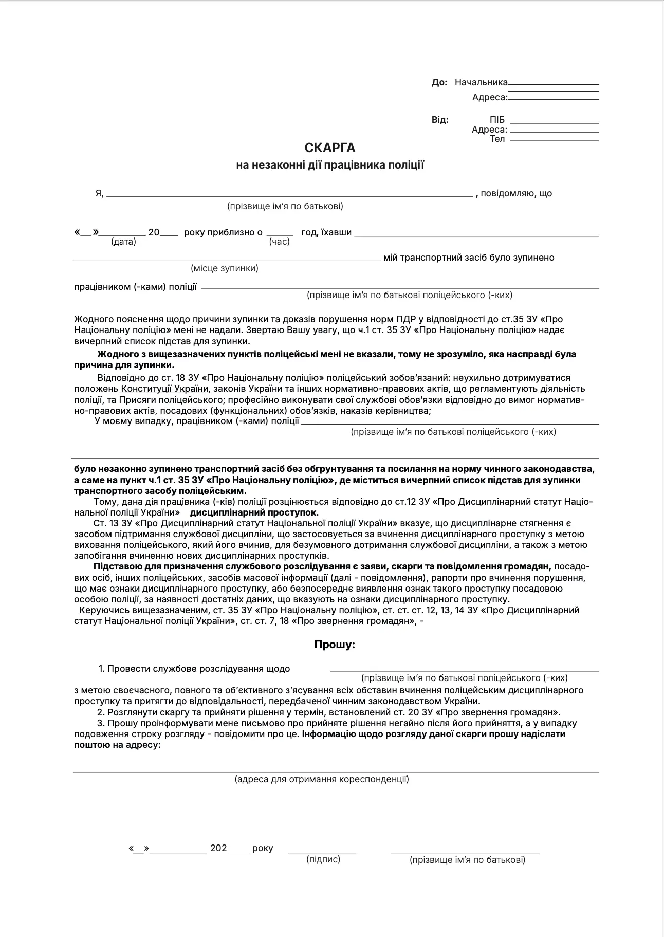 Зразок скарги на незаконні дії поліції